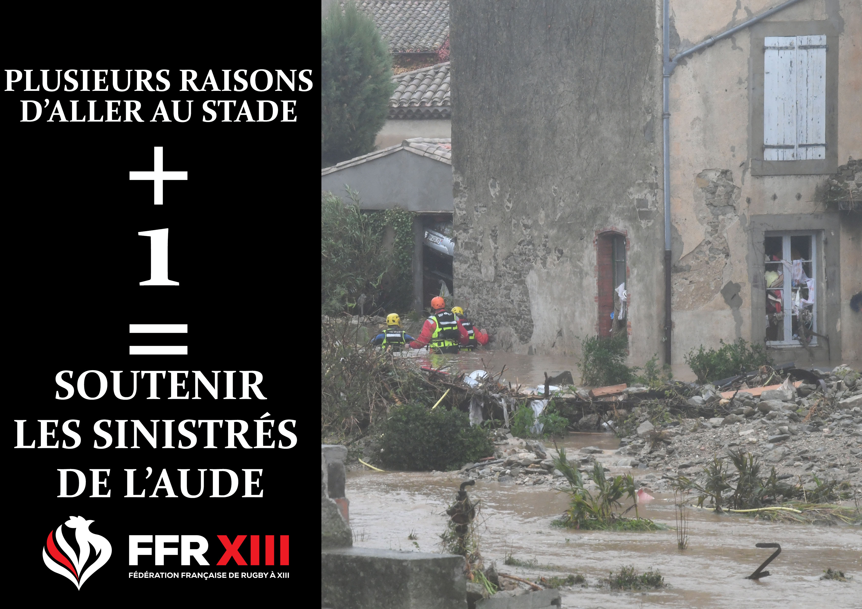 Devant le caractère exceptionnel et la gravité des événements qui endeuillent aujourd’hui le département de l’Aude, le président de la Fédération Française de Rugby à XIII (FFRXIII) vient d’annoncer que l’intégralité de la recette de la rencontre France vs Angleterre (féminines) et France vs Pays de Galles du samedi 27 octobre (comptant pour le Championnat d’Europe 2018) sera reversée aux sinistrés du département.
