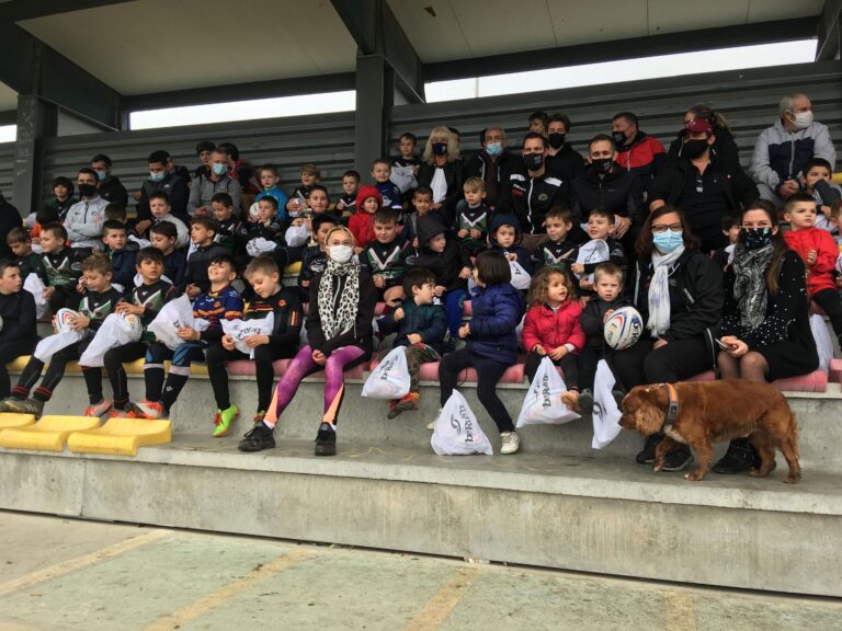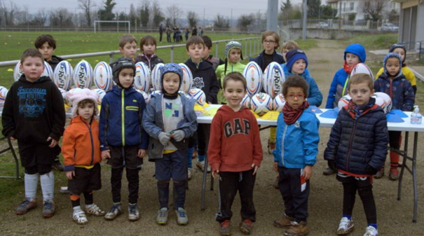 Les 49 enfants de l’école de rugby ont reçu un ballon -Les plus jeunes devant leurs ballons offerts par la FFR XIII.