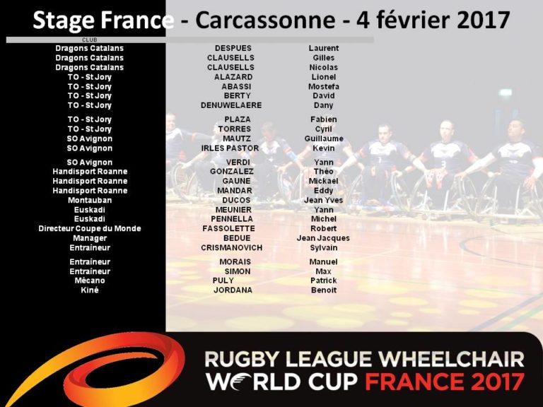 Stage de Sélection pour l’équipe de France de XIII Fauteuil et préparatoire pour la Coupe du Monde 2017. Le stage débutera le